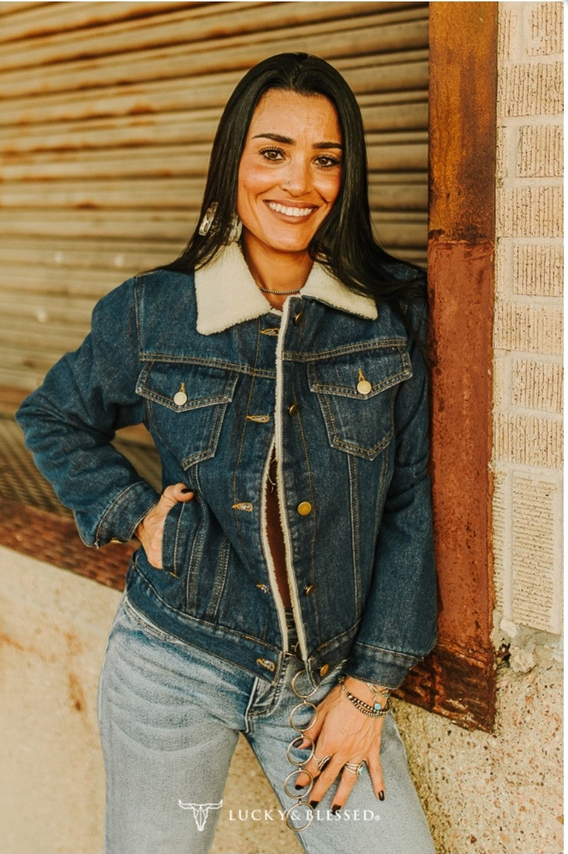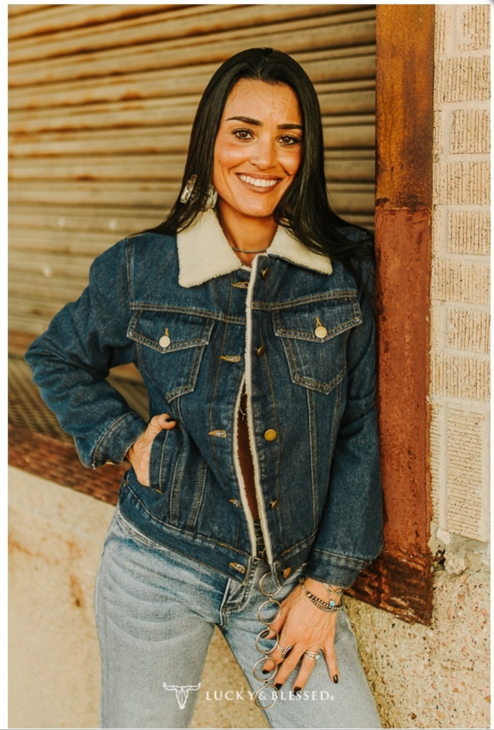 Solid denim button down jacket with pockets and lined sherpa.