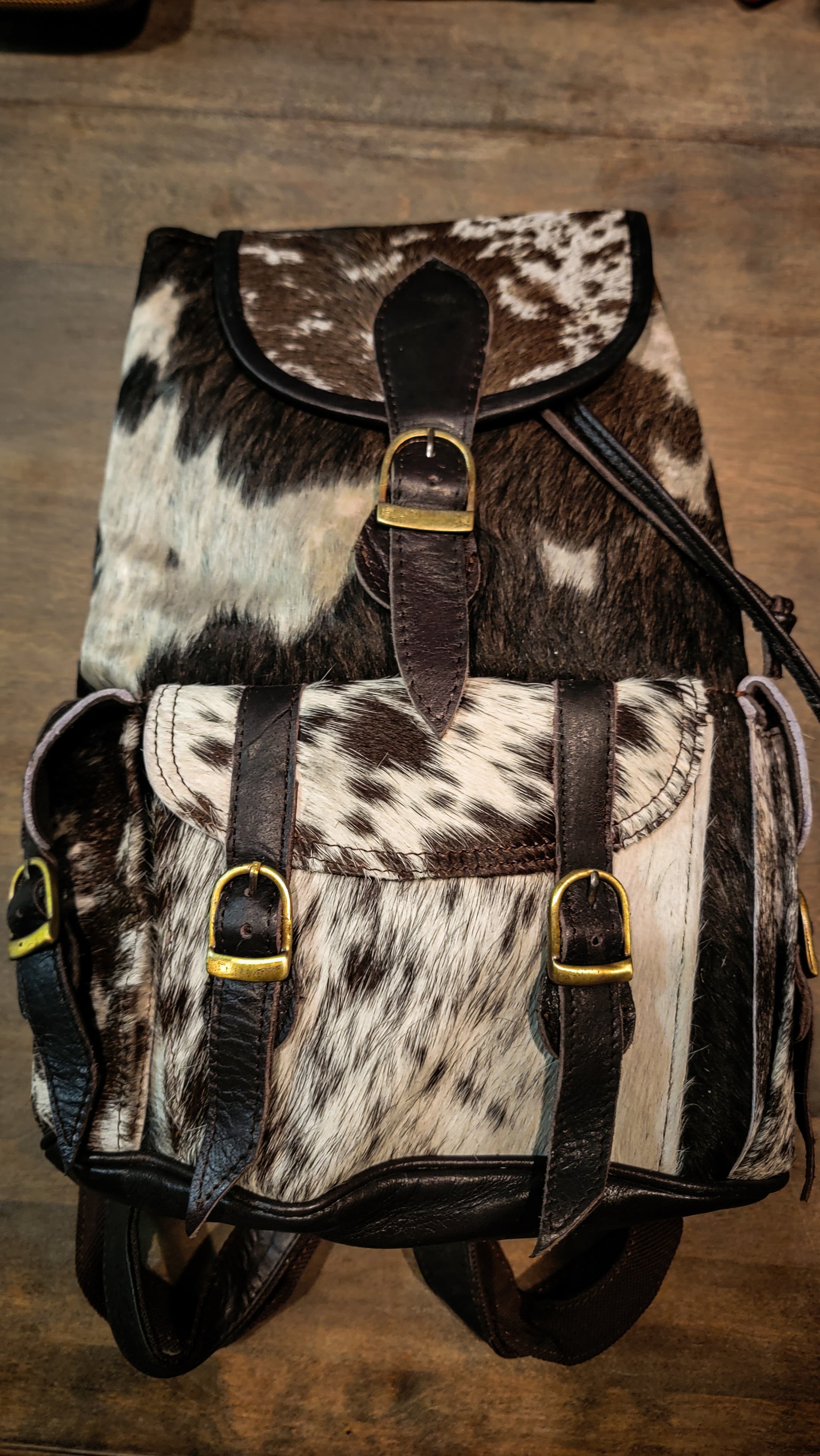 Gorgeous Genuine cowhide leather backpack. Backpack has adjustable straps and lots of pockets for storage space. Top of bag cinches up to adjust opening and also provides a magnetic snap close.